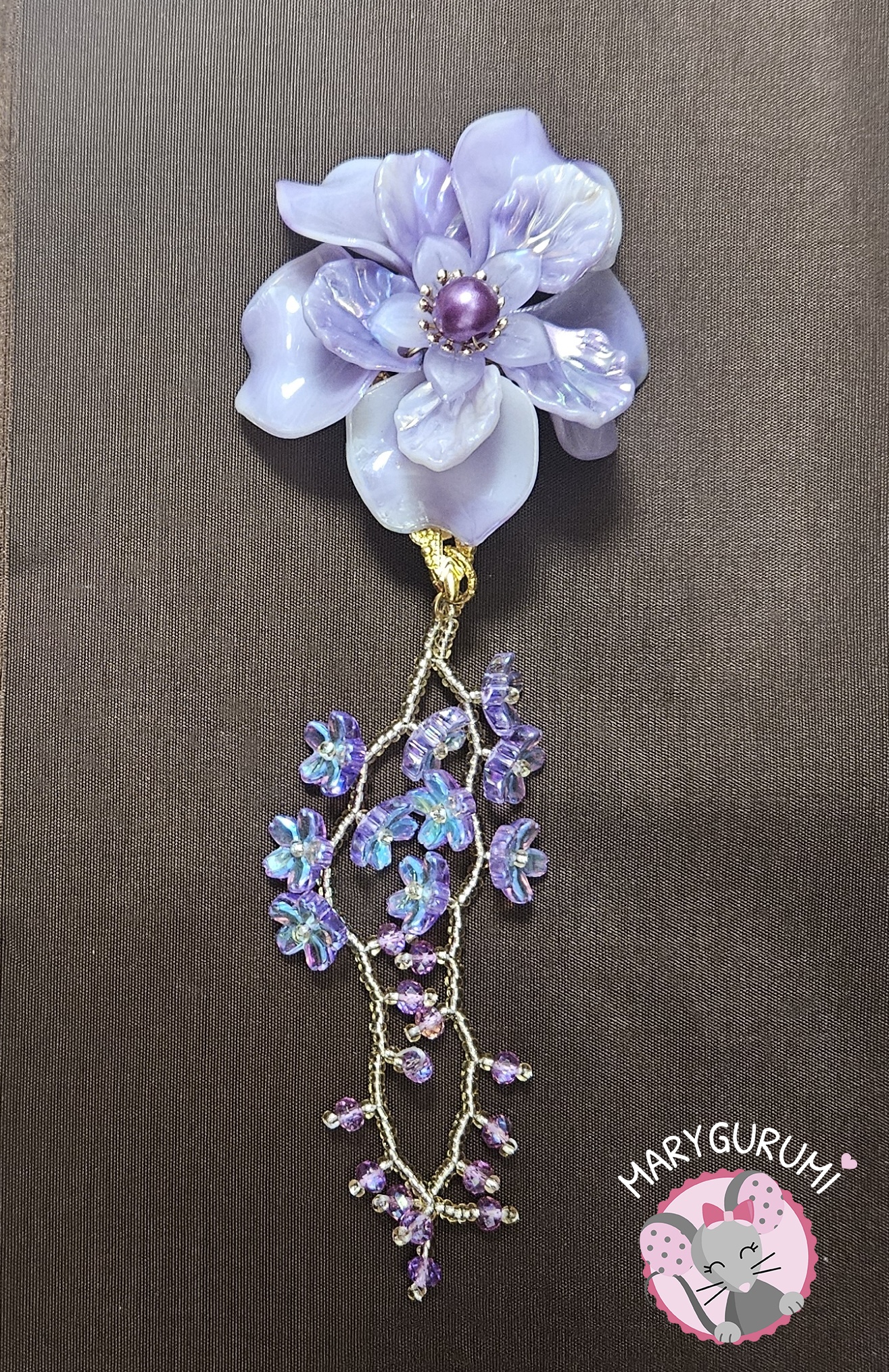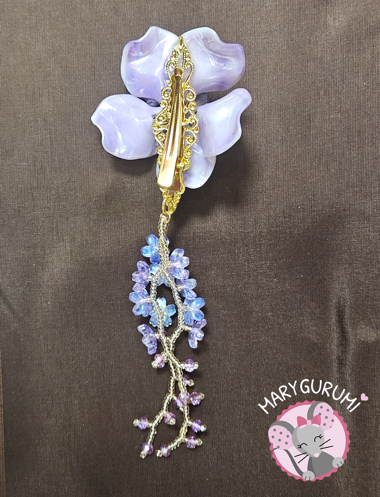 Bijou de cheveux fait main de 15 cm, orné d’une fleur violette translucide et de délicates pampilles de perles scintillantes montées sur une structure dorée, une création élégante et féérique qui apporte une touche lumineuse et raffinée à la coiffure.
