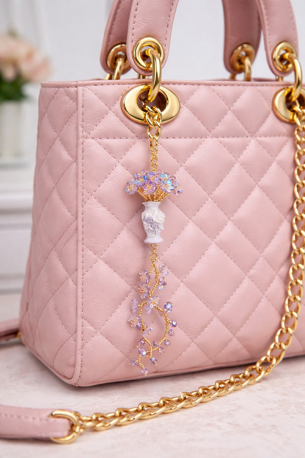 Bijou de sac fait main d’environ 9 cm de hauteur, orné d’un délicat vase aux détails floraux et d’un bouquet de fleurs violettes scintillantes prolongé par de fines chaînettes dorées, idéal pour apporter une touche poétique et élégante à votre sac — création artisanale, pièce unique.