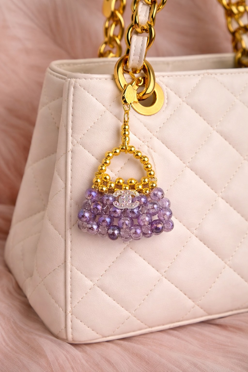 Bijou de sac d’environ 5 cm de hauteur, ce charm en perles violettes aux reflets délicats et détails dorés apporte une touche chic et lumineuse à votre accessoire préféré ; soigneusement réalisé à la main, il s’agit d’une création artisanale unique.