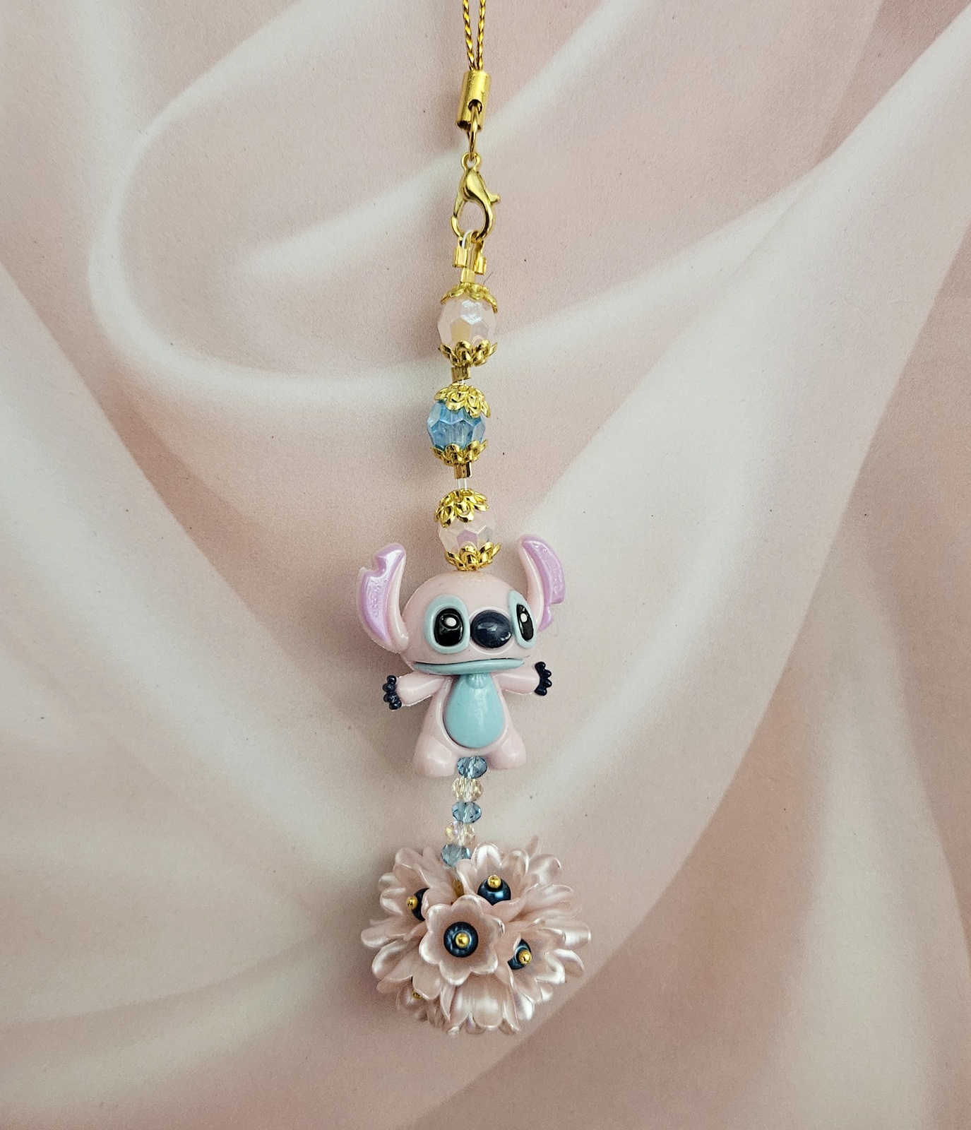 Bijou de sac d’environ 10 cm de hauteur, ce charm associe de délicates perles aux reflets pastel et des détails dorés raffinés, sublimés par un adorable petit personnage central et une fleur élégante en finition nacrée, pour apporter une touche douce et lumineuse à votre accessoire préféré ; chaque pièce est réalisée avec soin et constitue une création artisanale unique.