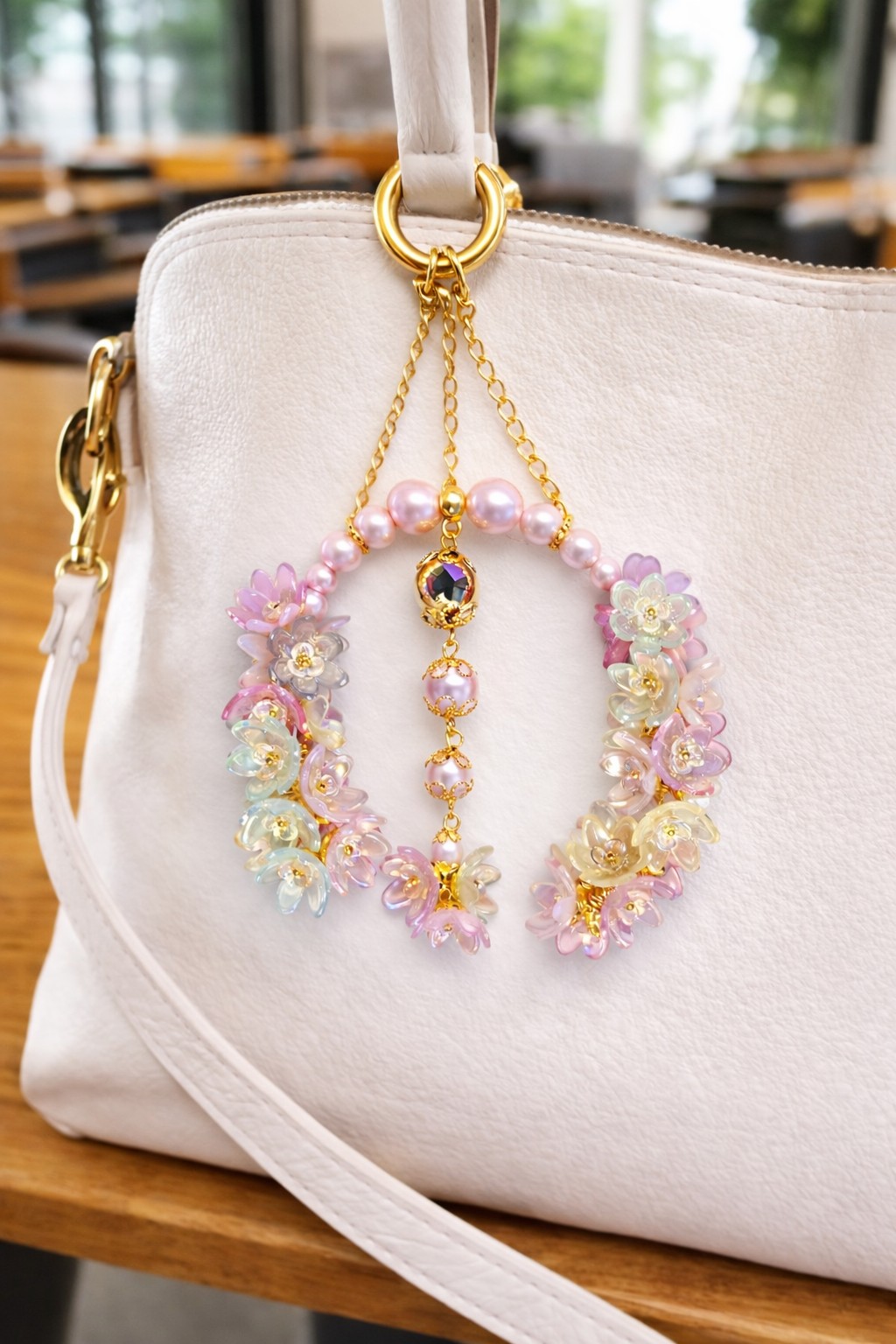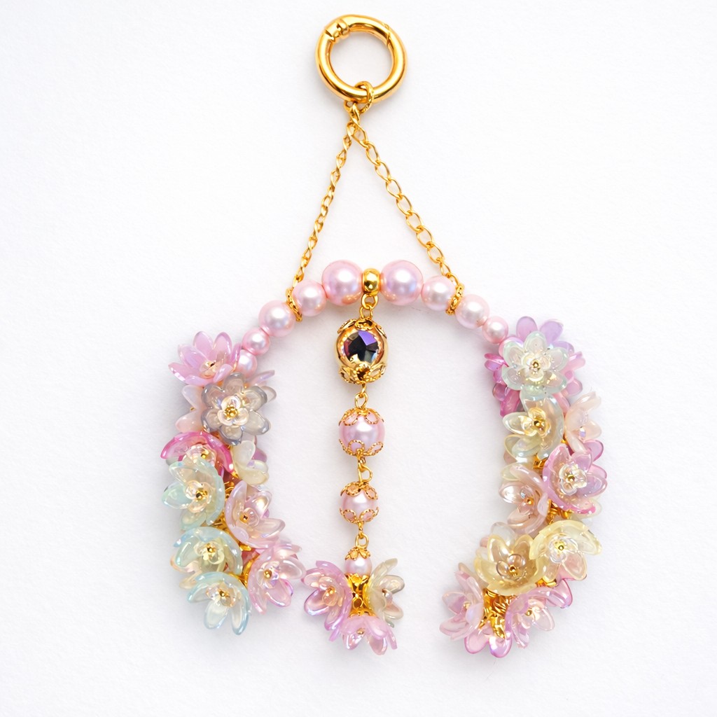 Bijou de sac fait main de 12 cm, délicatement orné de perles nacrées et de fleurs pastel aux reflets lumineux. Élégant et raffiné, il sublime instantanément votre sac.