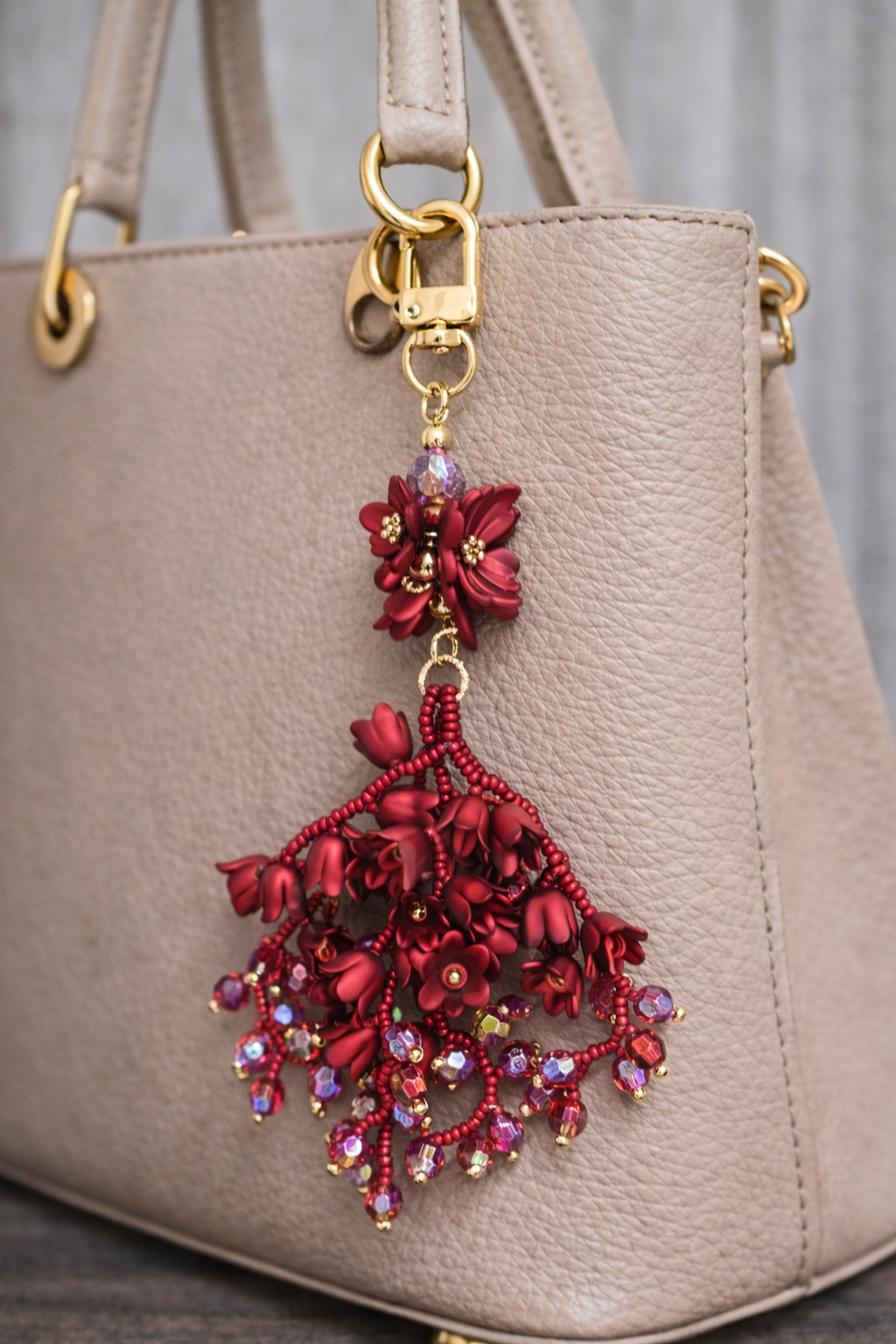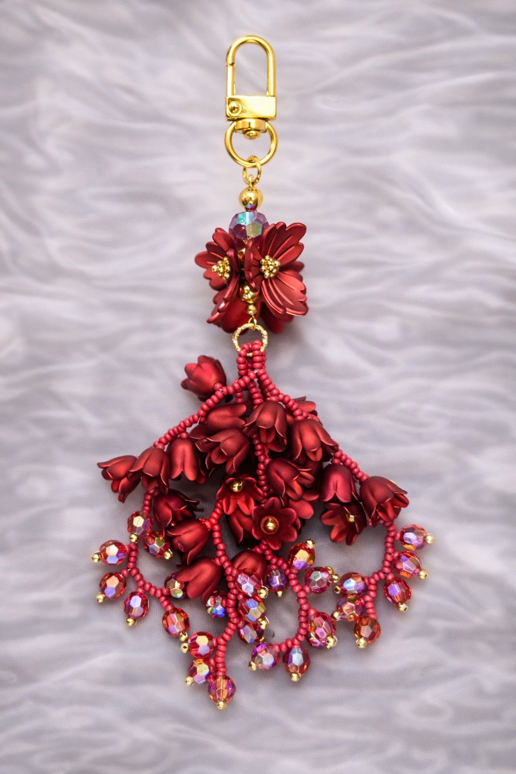 Bijou de sac fait main d’environ 11 cm de hauteur, sublimé par de délicates fleurs rouges profondes et des perles scintillantes aux reflets lumineux, il apporte une touche élégante, audacieuse et pleine de caractère à votre sac à main.