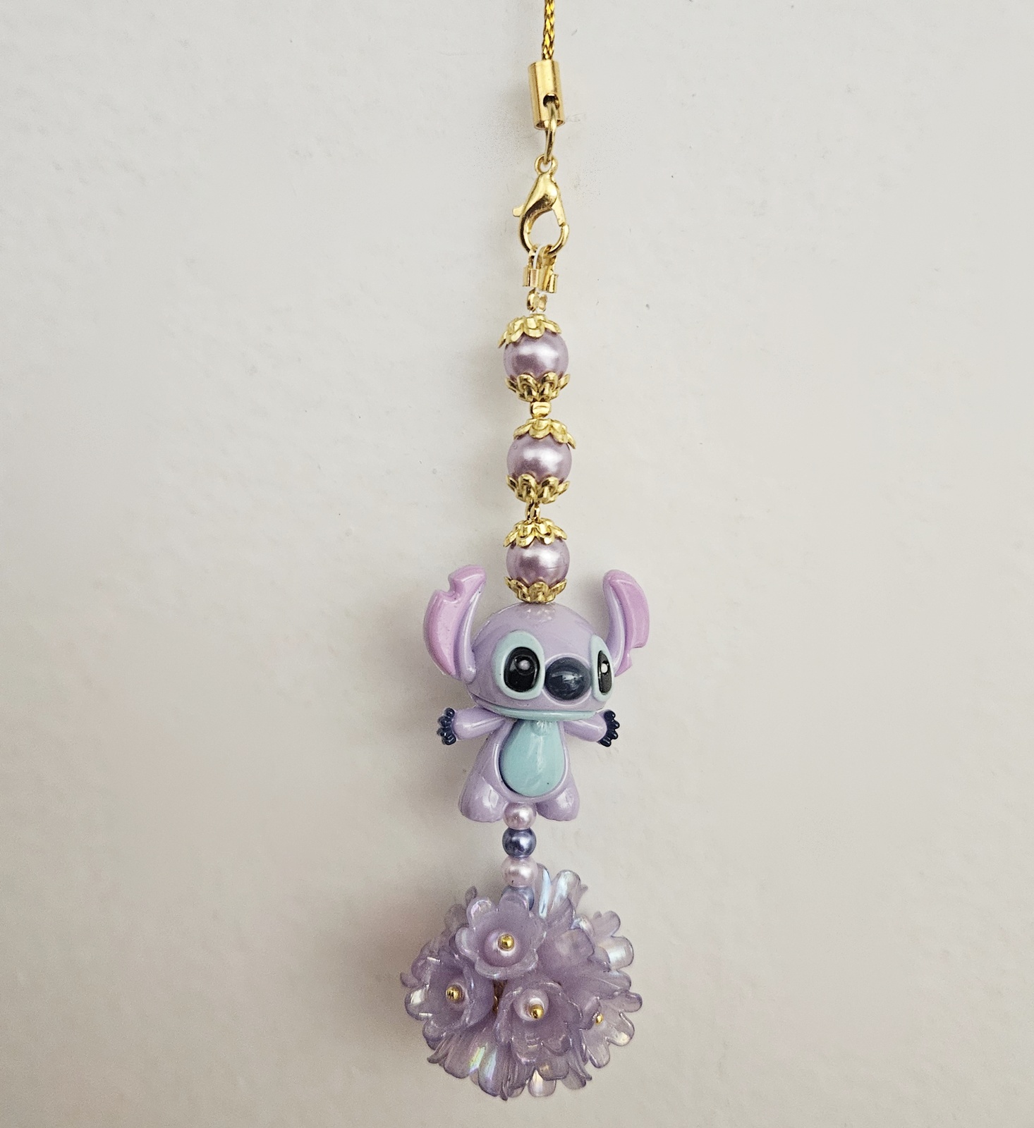 Bijou de sac fait main d’environ 8 cm de hauteur, orné de perles délicates et d’un adorable petit personnage aux tons lavande, il apporte une touche tendre et originale à votre sac ou à vos accessoires ; une création artisanale en pièce unique, réalisée avec soin et passion.