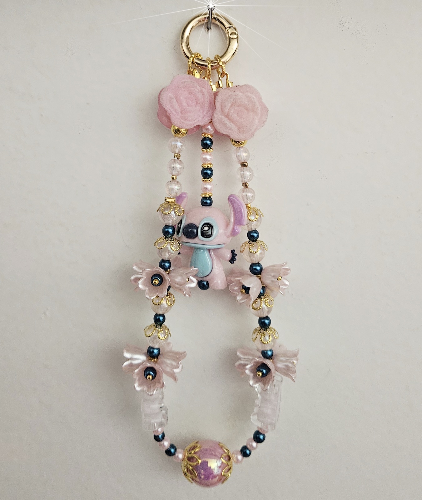 Bijou de sac ou de téléphone fait main d’environ 12 cm de hauteur, composé de perles délicates aux tons rose et bleu nuit, de fleurs raffinées et d’un adorable personnage central qui apporte une touche ludique et tendre à votre accessoire — création artisanale, pièce unique.
