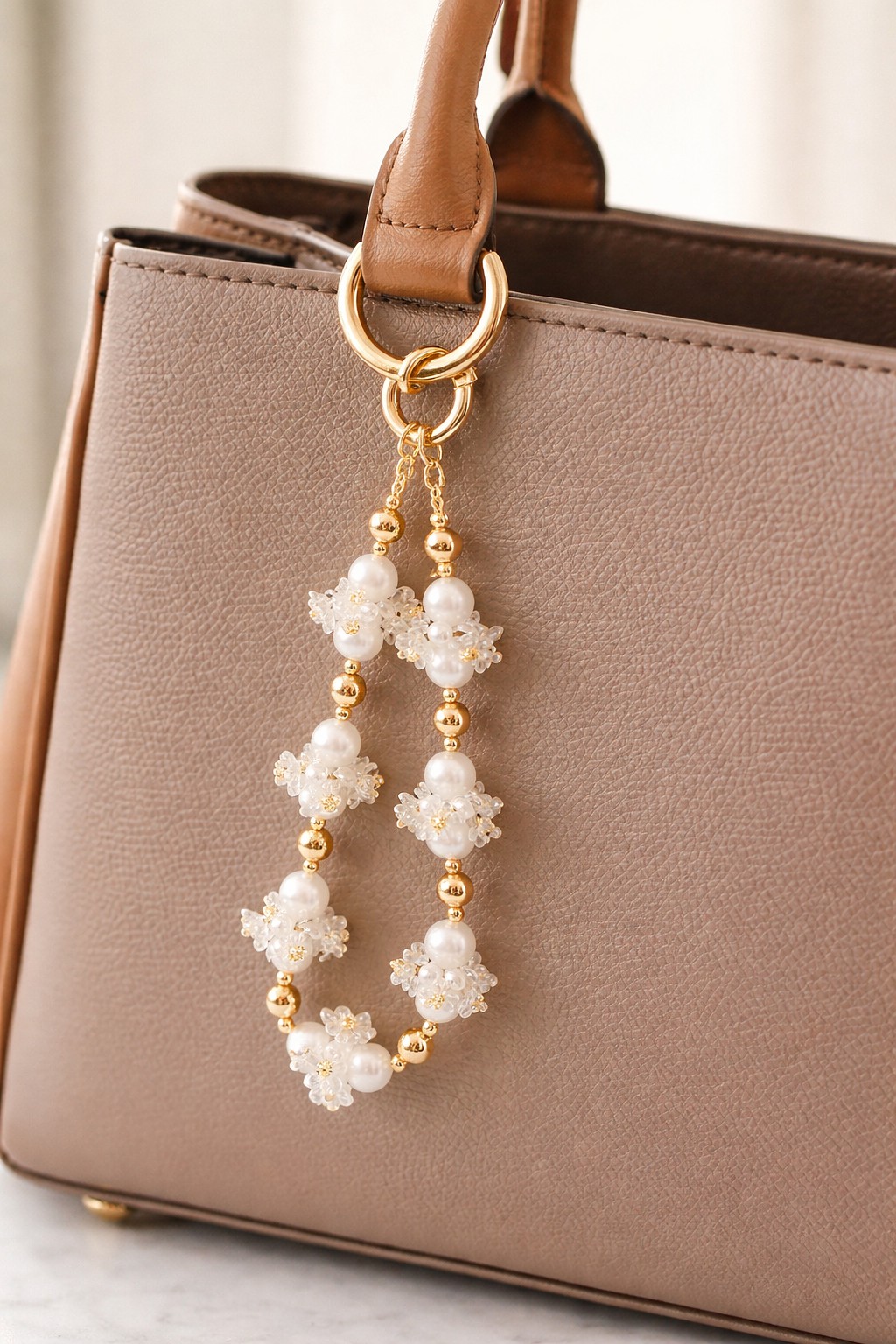 Entièrement réalisé à la main, ce bijou de sac et bijou de téléphone de 12 cm mêle perles lumineuses et détails dorés pour créer une pièce délicate et élégante. Un accessoire raffiné qui sublime aussi bien un sac qu’un smartphone avec une touche de douceur et de charme intemporel.
