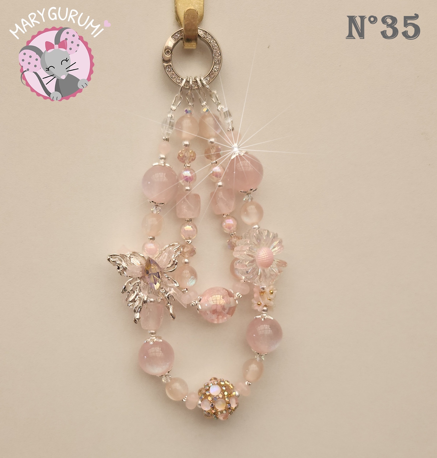 Riche en détails et entièrement réalisé à la main, ce bijou de sac et bijou de téléphone d’environ 14 cm de hauteur associe perles rosées, éléments floraux et touches scintillantes pour apporter une note raffinée et féminine à ton sac ou à ton téléphone.