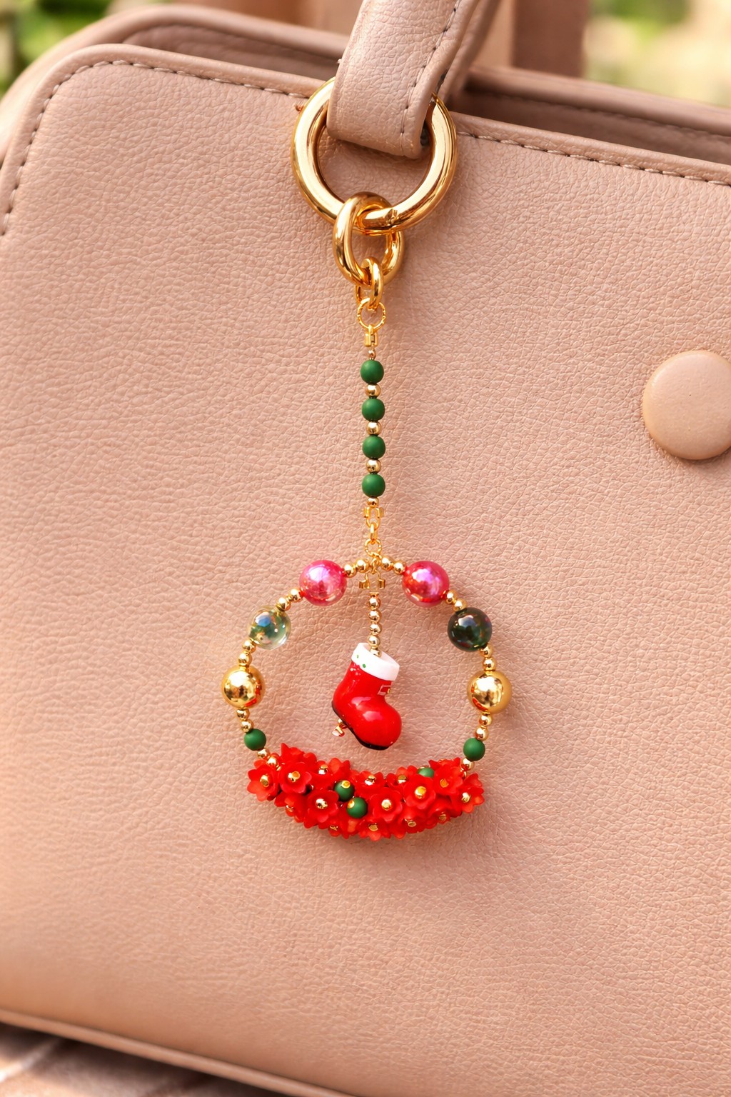 Festif et plein de charme, ce bijou fait main de 13 cm, à utiliser comme bijou de sac ou décoration de sapin de Noël, mêle perles colorées, détails dorés et petit élément décoratif central pour apporter une touche chaleureuse et joyeuse à ton sac ou à ta décoration de fêtes.