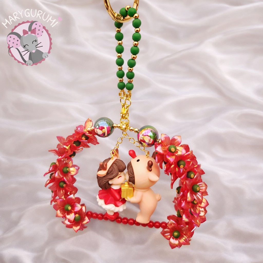 Bijou de sac, décoration d’intérieur ou de voiture, réalisé à la main, d’environ 16 cm. Cette création festive met en scène une couronne florale rouge et verte aux reflets scintillants, sublimée par des perles brillantes et des finitions dorées. En son centre, un adorable duo plein de tendresse, échangeant un petit cadeau, apporte une touche chaleureuse et joyeuse. Une pièce idéale pour personnaliser un sac, décorer un intérieur ou accompagner une décoration hivernale avec douceur.
