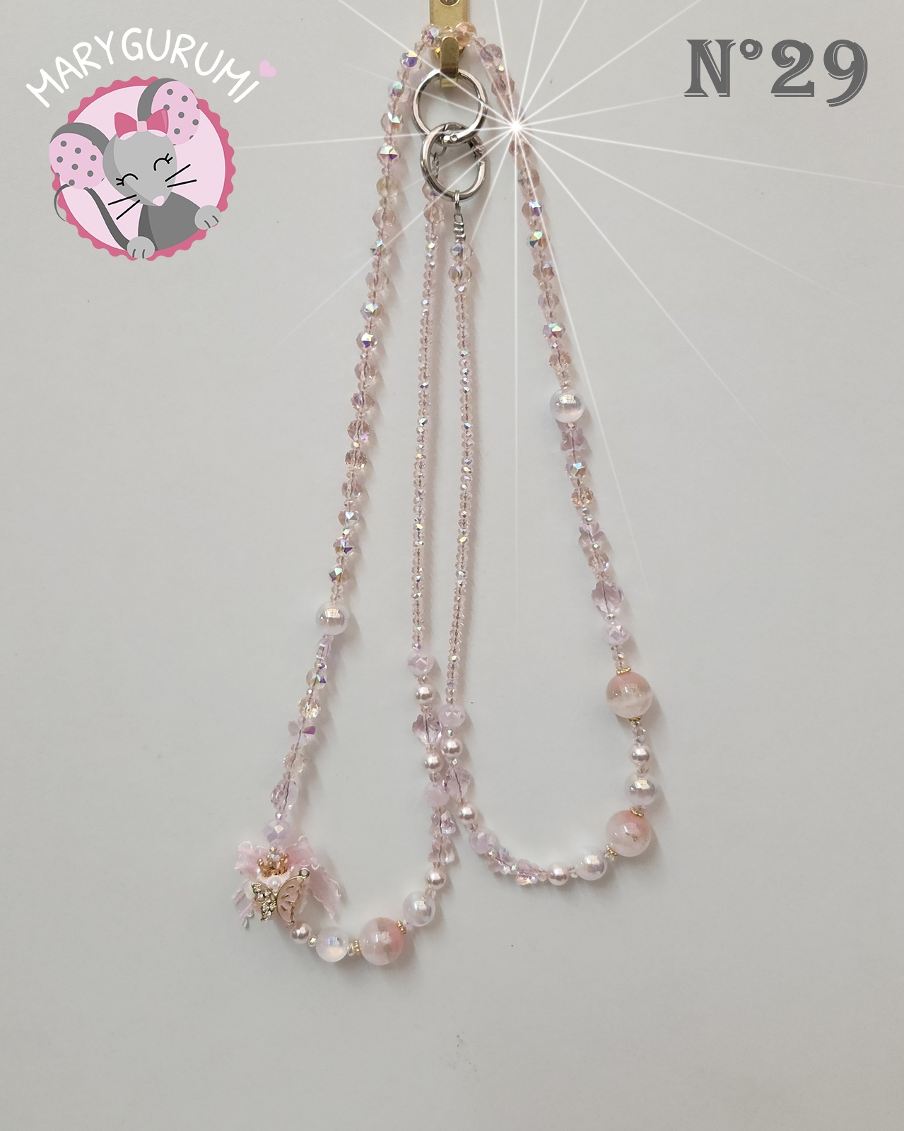 Délicate et raffinée, cette chaîne bandoulière de téléphone de 60 cm, entièrement réalisée à la main, associe perles aux reflets rosés, détails nacrés et finitions soignées pour transformer ton téléphone en véritable accessoire bijou, à la fois pratique et élégant.