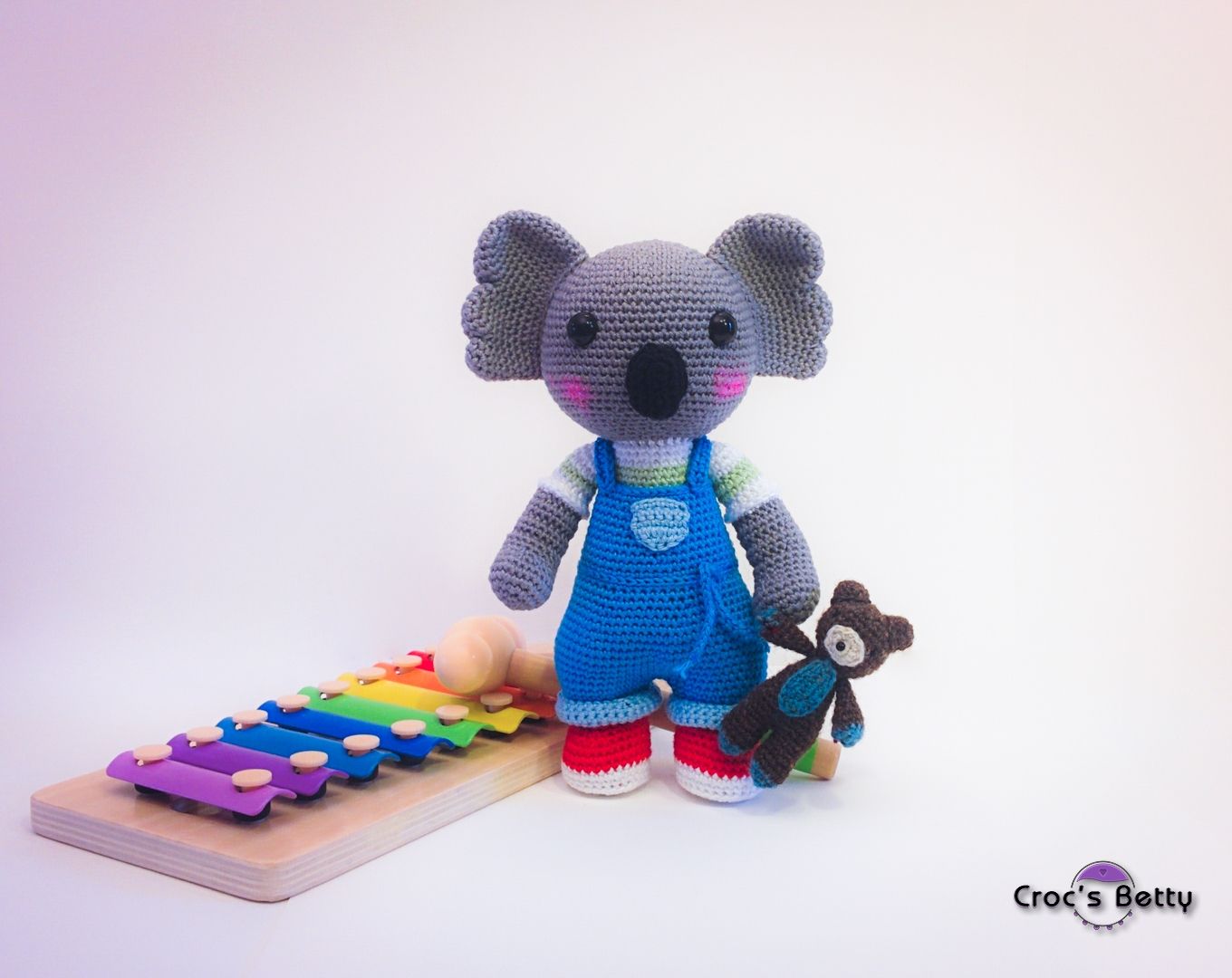 Il est ici crocheté en 2.25mm et mesure ainsi environ 23cm. Son Teddy bear est ici travaillé en 1.75mm et mesure environ 8cm mais il peut être travaillé en 2.25/2.5 également : il fera quelques cm de plus mais restera cohérent avec son petit maître.