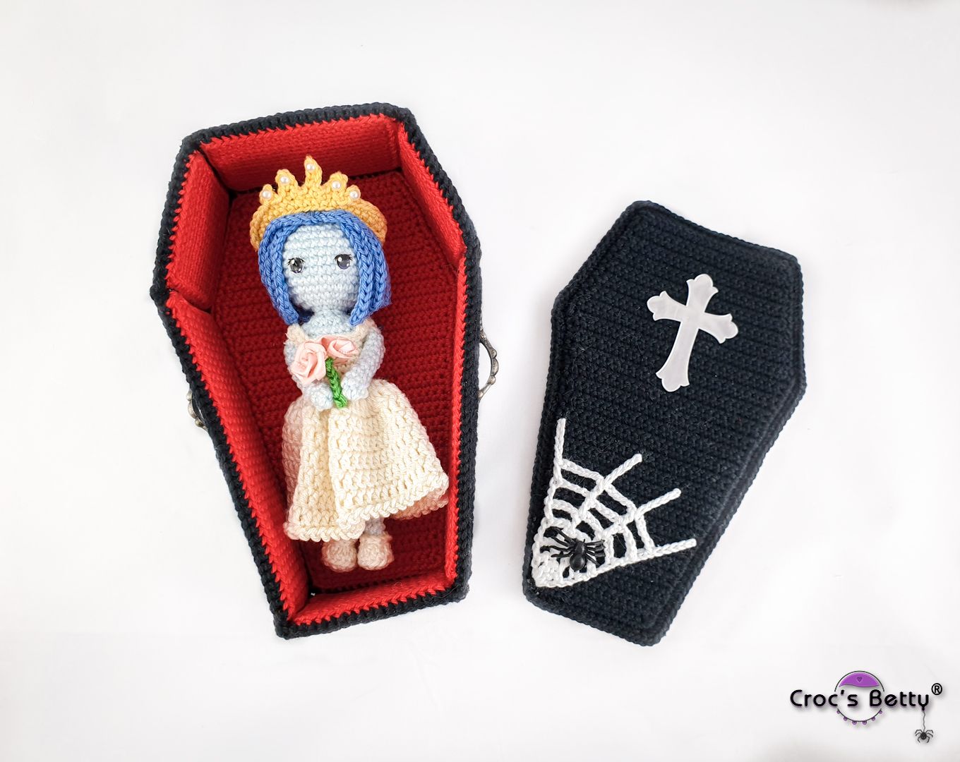 En suivant les instructions et les matériaux de ce tutoriel, la mariée mesurera environ 13cm et le cercueil environ 17cm de long sur 10cm de large. Ils seront de taille différente si vous utilisez un matériel (laine, coton, crochet) de calibre différent. Les proportions resteront néanmoins cohérentes et le résultat final identique de manière proportionnelle.